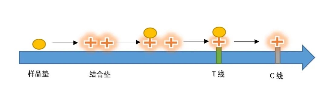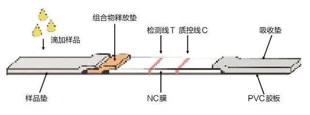 同时,人们在T线、C线固定有不同的抗体,当目标出现时,位于T线的抗体会拉住新冠病毒带有有色蛋白质的抗原抗体复合物,在样品里病毒数量足够多时,会在T线处显色。剩余的物质继续流动,与位于C线的抗体结合,用于判断流动过程(即层析过程)是否顺利。